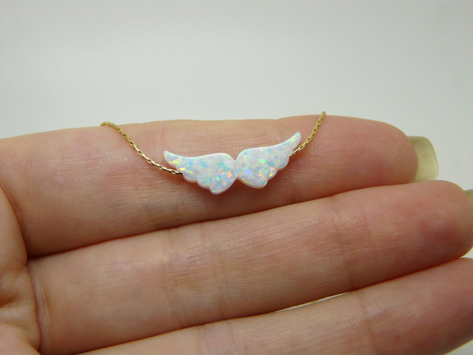 Opal Angel Wing Necklace – a symbol of love, faith, and guidance, crafted with a shimmering opal pendant in the shape of a delicate angel wing. The iridescent opal sparkles in shades of blue, pink, green creating a mesmerizing glow in the light. This necklace is a beautiful reminder of protection, remembrance, or a guardian angel watching over you. Suspended on a 14K gold-filled or sterling silver chain, it’s a meaningful and elegant piece for everyday wear.