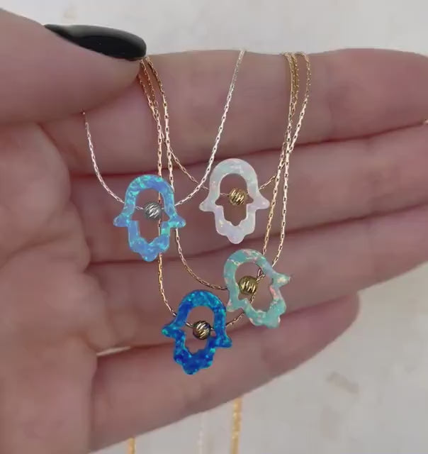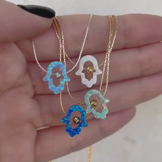 Bring positive energy into your life with this stunning opal Hamsa necklace. The Hand of Hamsa, a timeless symbol of protection and good fortune, is beautifully crafted from vibrant opal, creating a mesmerizing play of colors. Available in five opal shades, this meaningful pendant serves as a stylish accessory while carrying deep spiritual significance.