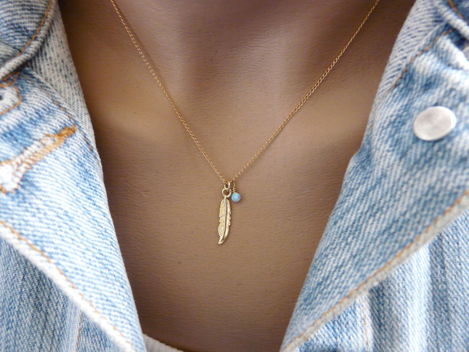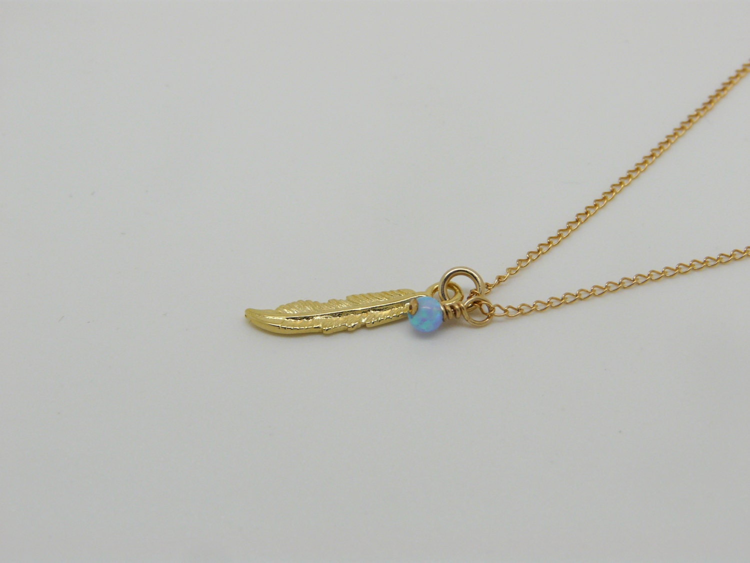 Feather necklace-Gold feather-Feather pendant-Opal necklace-Delicate necklace-Boho necklace
