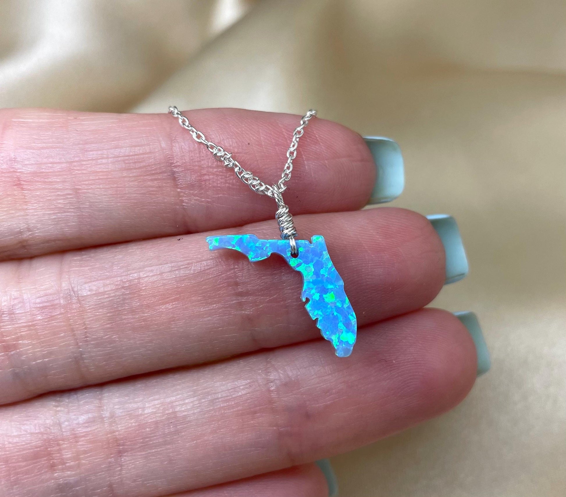 Celebrate the Sunshine State with this beautiful Florida shaped opal necklace. Available in blue or white opal, this dazzling pendant shimmers with vibrant color as it catches the light. Whether you're a Florida native or simply love this iconic state, this necklace is a chic way to showcase your connection.