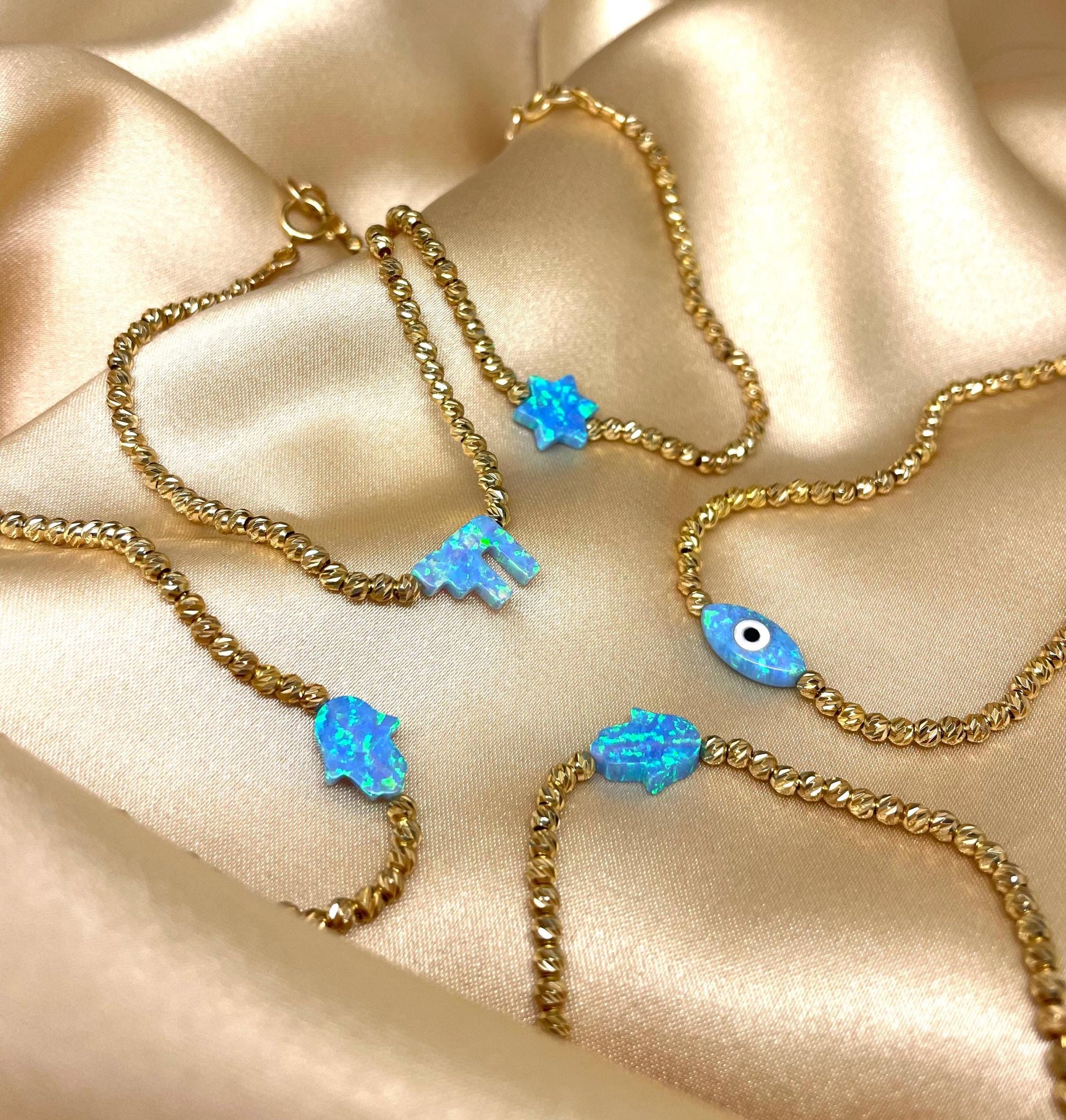 This Judaica Charm Bracelet features a choice of four meaningful opal charms: Hamsa Hand, Star of David, Chai Symbol, and Evil Eye. Each charm carries deep cultural significance – the Hamsa offers protection, the Star of David symbolizes faith, the Chai symbolizes life, and the Evil Eye wards off negative energy. Handcrafted with shimmering opal and luxurious gold-filled or sterling silver beads, this bracelet is both meaningful and elegant, perfect for daily wear or gifting.