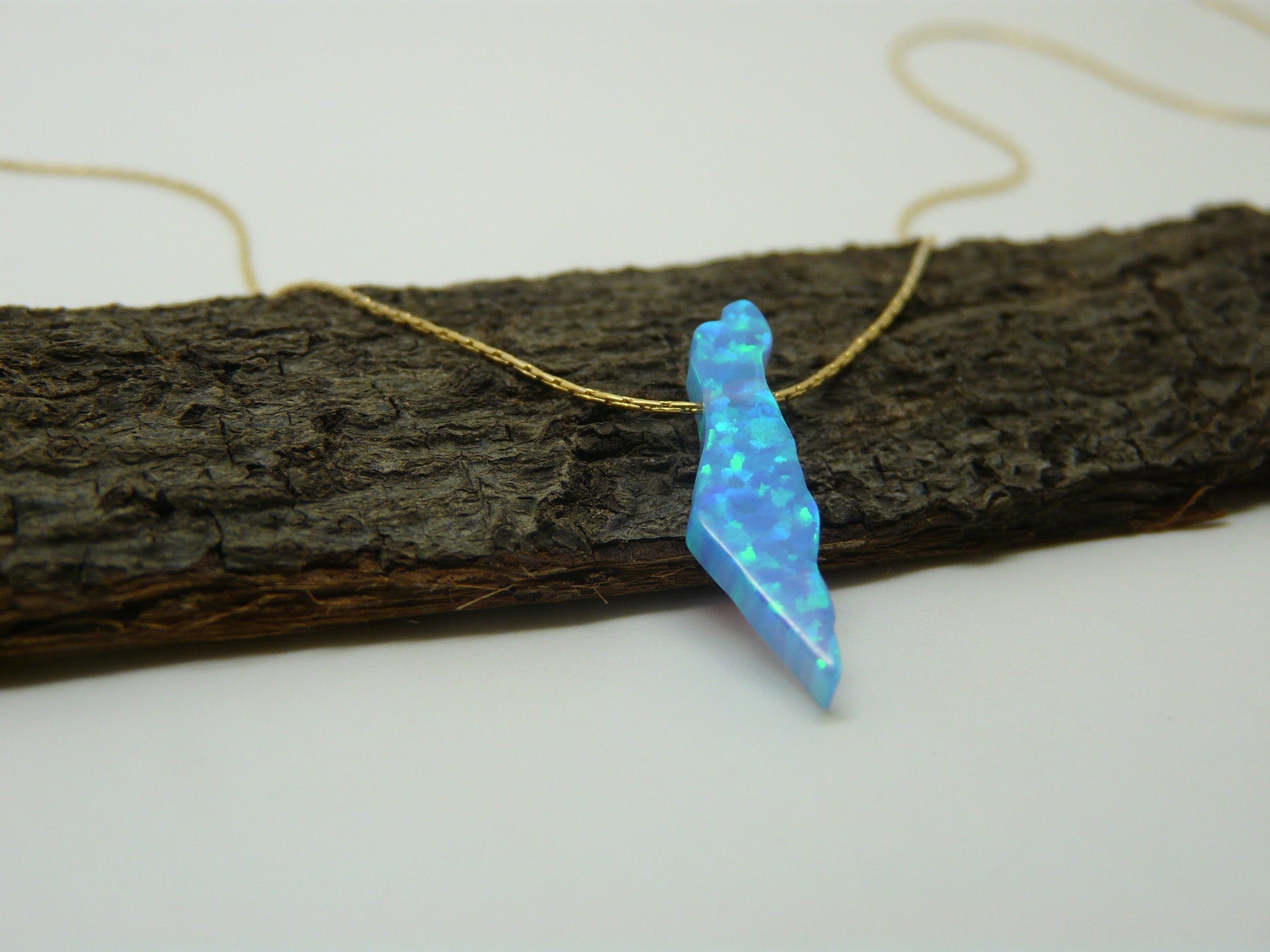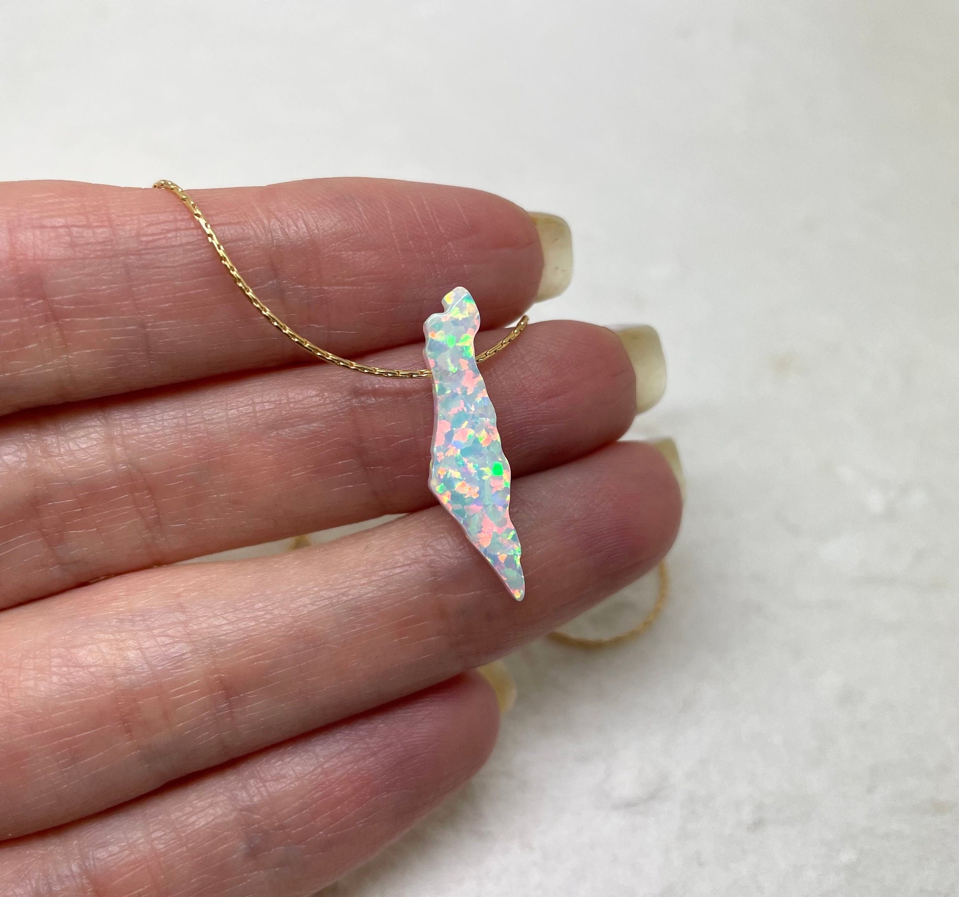 This Opal Israel Map Necklace is a stunning piece of Jewish jewelry that beautifully symbolizes your love and connection to the Holy Land. Crafted with shimmering lab created opal, each pendant reflects light with mesmerizing iridescence capturing the pride, spirit, and beauty of Israel.