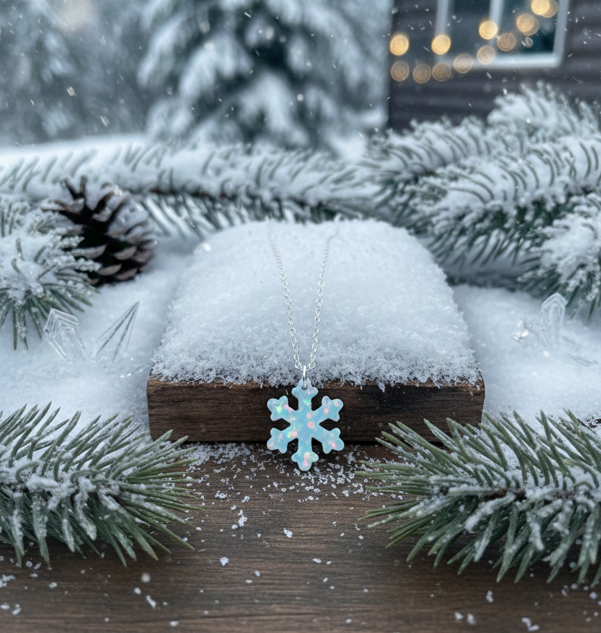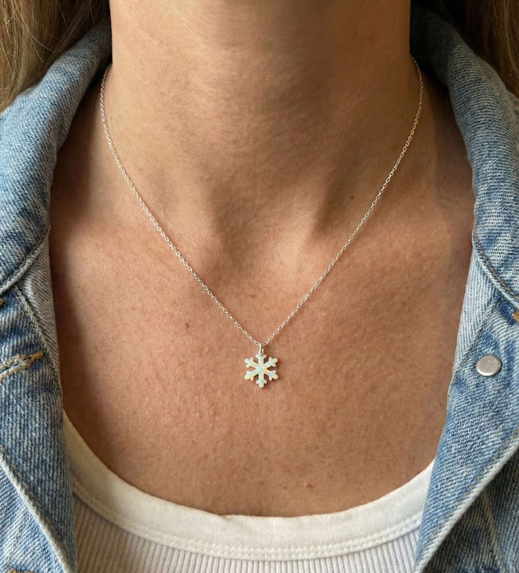 Bring winter’s magic to life with this dreamy Opal Snowflake Necklace. Each snowflake charm glows with beautiful iridescent colors, soft blues, greens, and pinks just like fresh snow sparkling in the sunlight. Paired with your choice of a non-tarnish gold-filled or sterling-silver chain, this piece is dainty, unique, and full of cozy winter charm.