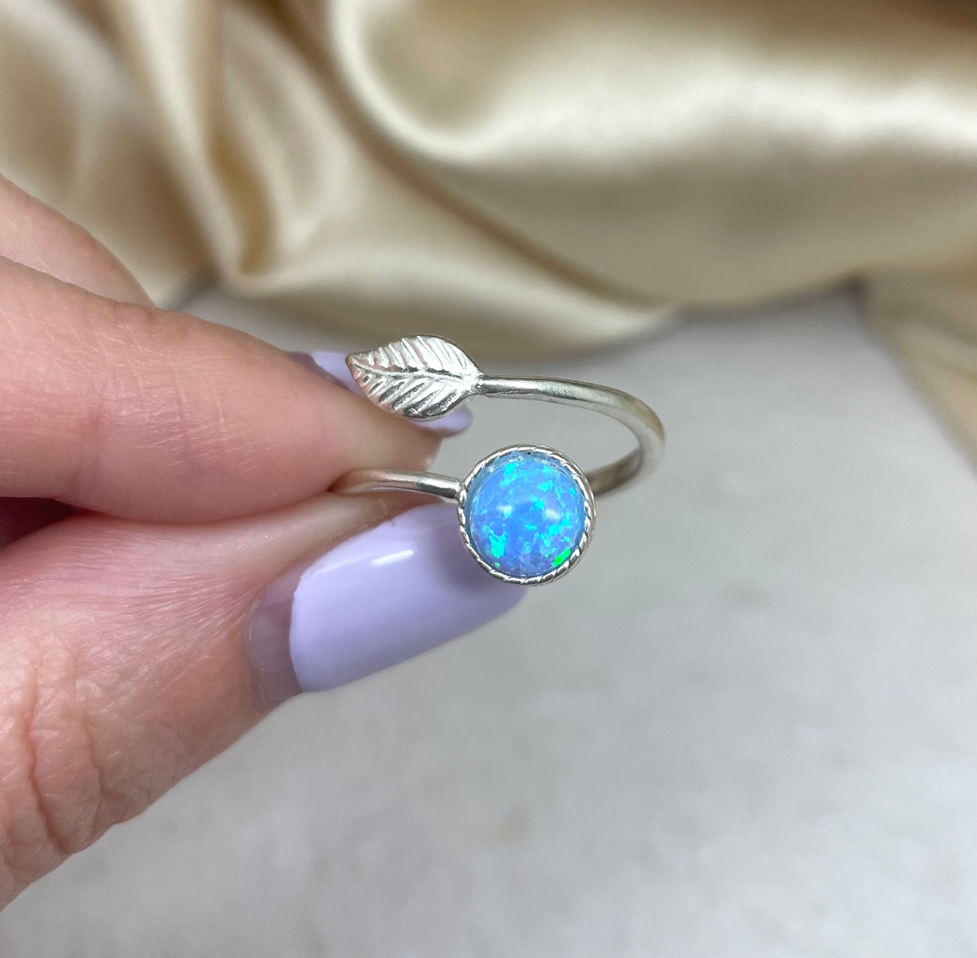 Sterling silver opal ring with adjustable leaf design – handmade, dainty, and available in many gorgeous colors. This charming ring features a glowing opal gemstone embraced by a delicate silver leaf wrap, creating a whimsical and nature-inspired piece you'll want to wear every day.