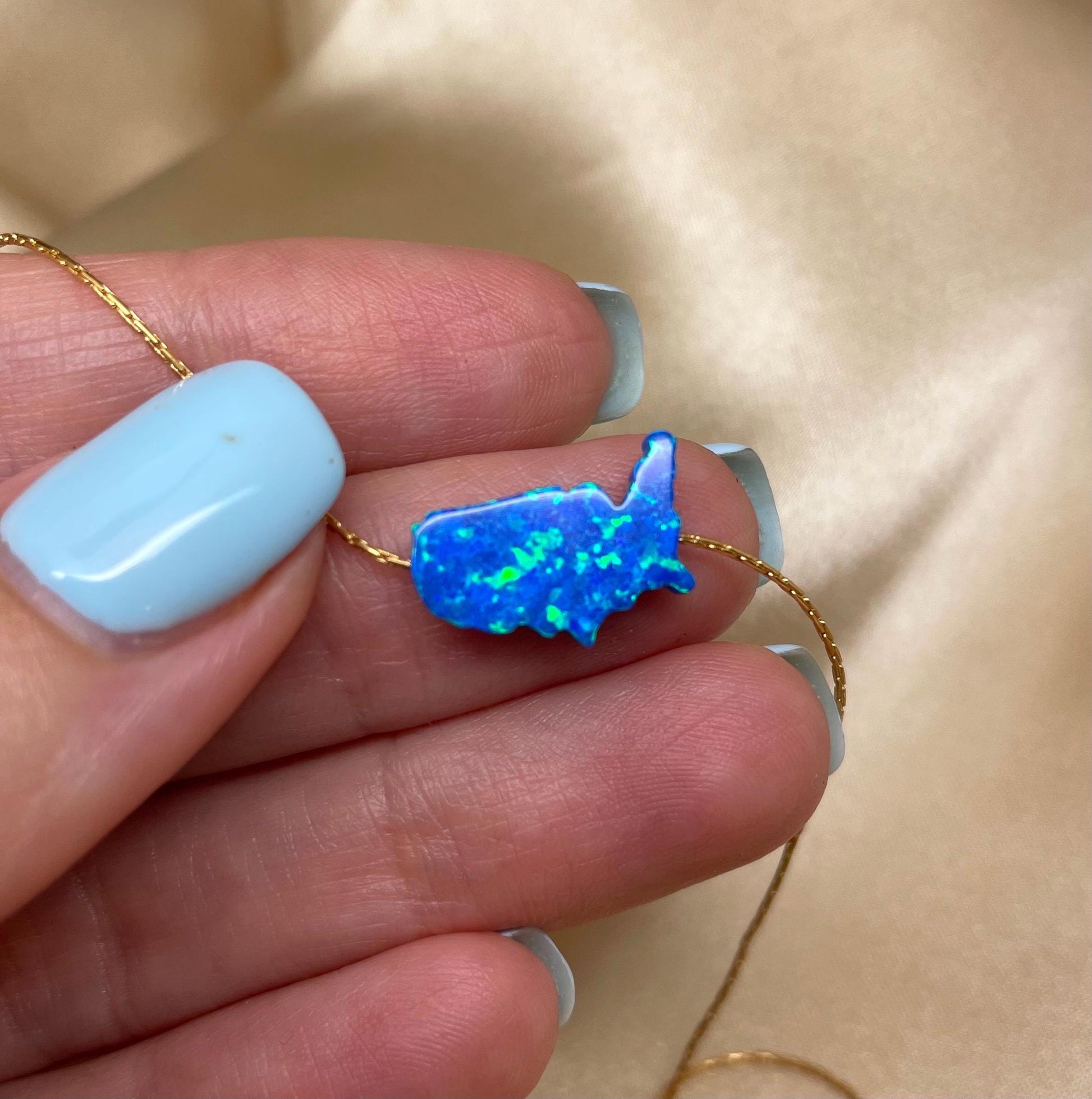 Show off your love for the United States with this beautifully crafted USA map pendant necklace. Designed in the shape of the USA, this opal charm shimmers in two stunning colors – Royal Blue and Snow White, reflecting the spirit of freedom and patriotism.